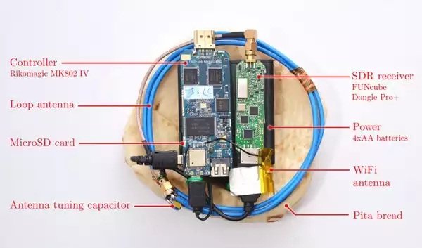 Pero ya que el acrónimo de Portable Instrument for Trace Acquisition (nombre de la versión portátil de este hackeo) responde a las siglas PITA, ¿por qué no aprovechar la coincidencia y crear un desarrollo realmente llamativo? Así, además del pan de pita, estos hackers demasiado aficionados a los kebabs necesitaron de una radio AM, una radio definida por software FUNcube Dongle Pro+ y un mini-ordenador Rikomagic MK802 IV basado en Android. Todo ello complementado por los componentes necesarios para alimentar el dispositivo y almacenar los datos recabados.