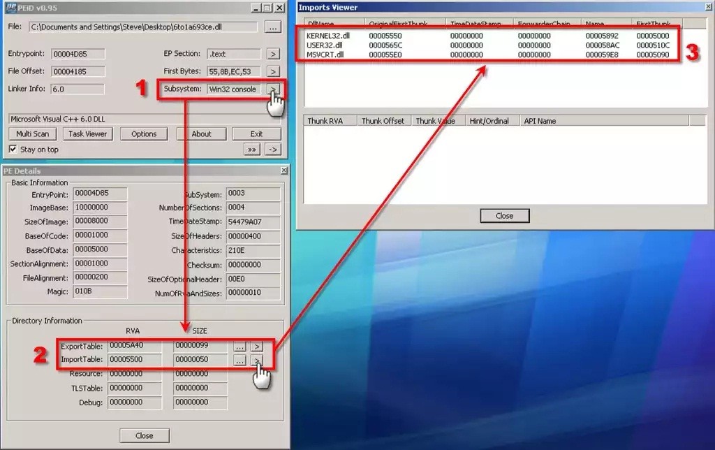 Puede verse que en la captura de pantalla se encuentran enumerados los pasos a seguir una vez analizada la librería. Una vez abierta en la herramienta haciendo clic en el símbolo marcado en el recuadro número 1, este abrirá una ventana como la situada en la parte inferior. Dentro de la ventana abierta podemos ver que el recuadro “Directory Information” permite listar las DLL que se importan y exportan (remarcado en el recuadro número 2). Para el ejemplo decidimos mostrar las librerías que son importadas: KERNEL32.dll, USER32.dll y MSVCRT.dll.